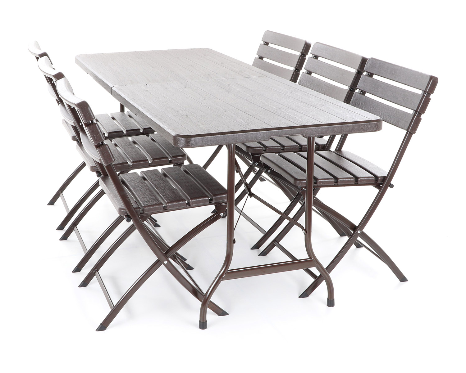 Stolová sestava 6-ti skládacích židlí z ocelových profilů, povrchově dokončena komaxitovou barvou, čalounění je v imitaci masivního dřeva z lisovaného plastu s UV filtrem.