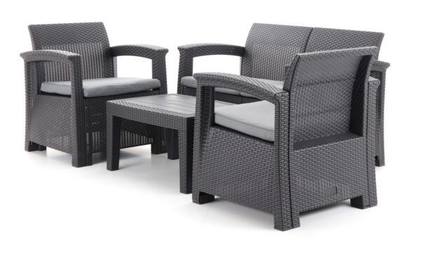 Nábytek má originální povrchovou strukturu napodobující přírodní ratan. Ideální pro pohodlné venkovní posezení na Vaší zahradě či terase.