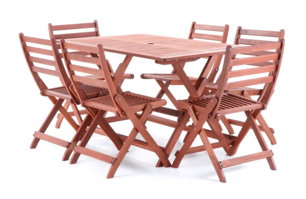 Luxusní zahradní nábytek VeGA SET 6- je vyroben z tmavě červeného meranti. Meranti je označení pro více druhů dřevin z rodu Shorea pocházejících z jihovýchodní Asie. Meranti je nejžádanějším z tropických materiálů na výrobu zahradního nábytku. Tato dřevina našla své uplatnění jak v interiéru pro svůj dekorativní vzhled ( má unikátní červenohnědou barvu díky které na každém kusu nábytku dokonale vynikne kresba dřeva) , ale především v exteriéru na výrobu zahradního nábytku, oken a dveří pro svoji vynikající trvanlivost, dlouhou životnost, vysokou tvrdost a dobrou opracovatelnost.
