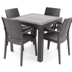 Stolová sestava se skládá ze 4 pohodlných masivně vyztužených křesel v imitaci umělého ratanu s UV filtrem. Rozměr křesla: 55 x 54 x 85 cm. Stůl je ve tvaru čtverce, také v imitaci umělého ratanu s UV filtrem. Stůl z pryskyřice Simil-rattan Rozměr stolu: 80 x 80 x 72 cm. Barva: hnědá – odstín espresso Ratanový plastový nábytek Díky inovativnímu procesu…
