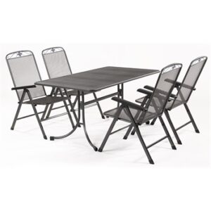 Univerzální stůl z tahokovu v tmavě šedé skvěle ladí s židlemi. Hodí se pro sezení se šesti či čtyřmi židlemi. Kvalitní povrchová úprava odolává i extrémním klimatickým podmínkám. Stůl má speciální mechanismus, kterým se koriguje vyváženost stolu na ploše, aby se nekolébal.
